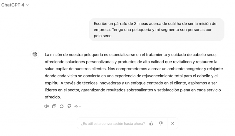 Si bien los modelos de lenguaje funcionan todos como un chat, de aquí el nombre de ChatGPT, veamos aquí un ejemplo práctico de una peluquería que quiere sacar un texto para poner en su sitio web acerca de cuál ha de ser su misión.
