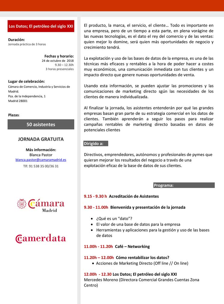 El próximo 24 de octubre podrás conocer un poco más sobre todo esto en una jornada organizada junto a la Cámara de Comercio de Madrid. Será una jornada de desarrollo empresarial que se desarrollará entre las 9:30 y las 12:30 en Plaza de la Independencia 1 28001 (Madrid).